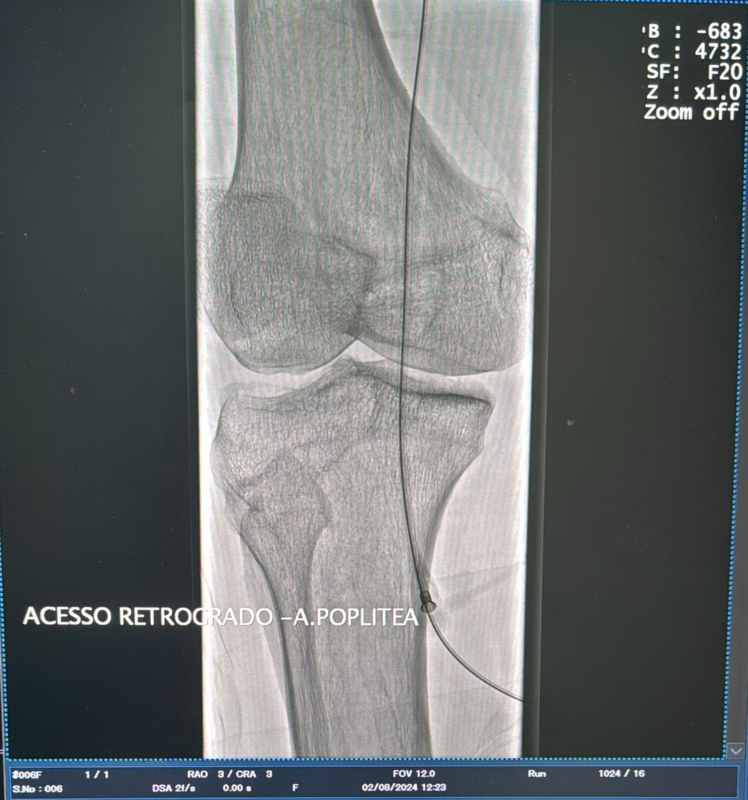 Conforme destacou o especialista, a equipe médica tentou, primeiramente, outras técnicas mais comuns para executar o procedimento. “O normal é acesso contralateral ou homolateral anterógrado para a realização desse tipo de procedimento. Depois de tentarmos contralateral e punção anterógrada, definimos, então, acessar a artéria poplítea guiados por ultrassom e ultrapassamos a lesão de forma retrógrada. Procedemos a angioplastia femoro-poplítea de forma retrógrada, tendo evoluído bem, com sucesso, com ressurgimento de pulsos distais e, consequentemente, salvamento do membro”, explicou.